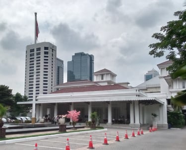 The State Palace (Istana Negara) is located on Jalan Veteran and faces the Ciliwung River. The palace is backed by the Merdeka Palace which faces the National Monument Park and is connected by the Central Courtyard. The State Palace environment includes several other buildings, namely the Presidential Office, the State Guesthouse, the Baiturrahim Mosque, and the Presidential Palace Museum.